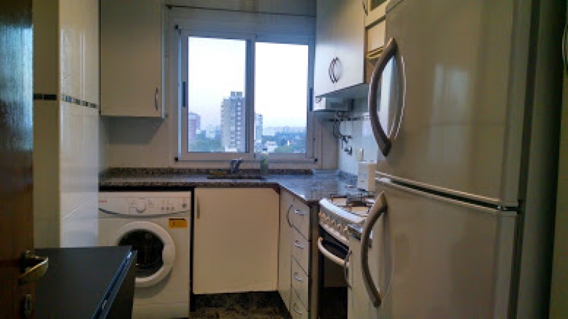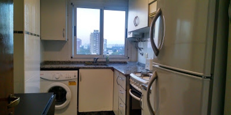 Cocina con mueble alto y bajo mesada equipada con LAVAROPA automatico, microondas, heladera con freezer, cafetera, tostadora y juguera electrica, vajilla completa para 4 personas.
